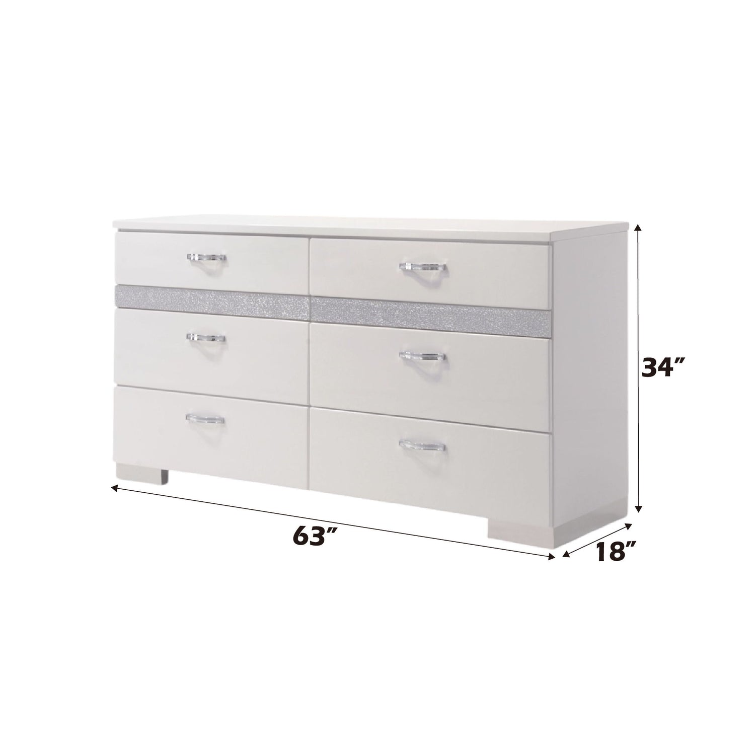 - Chic Accents: Glittery accents on the drawer fronts add a touch of glamour, complemented by sleek metal handles that provide both style and ease of use, enhancing the dresser's overall chic appeal.