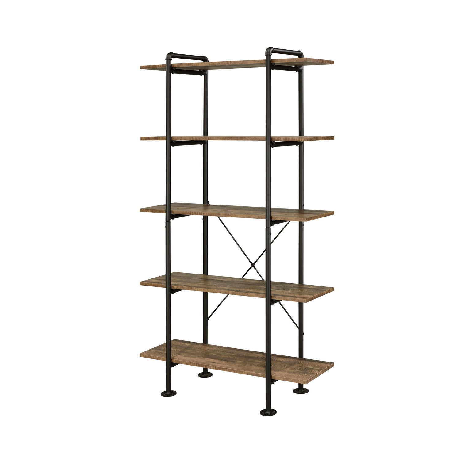 - Industrial and Rustic Design: This bookshelf combines industrial flair with rustic charm, featuring a beautiful rustic oak finish paired with a bold black metal base.