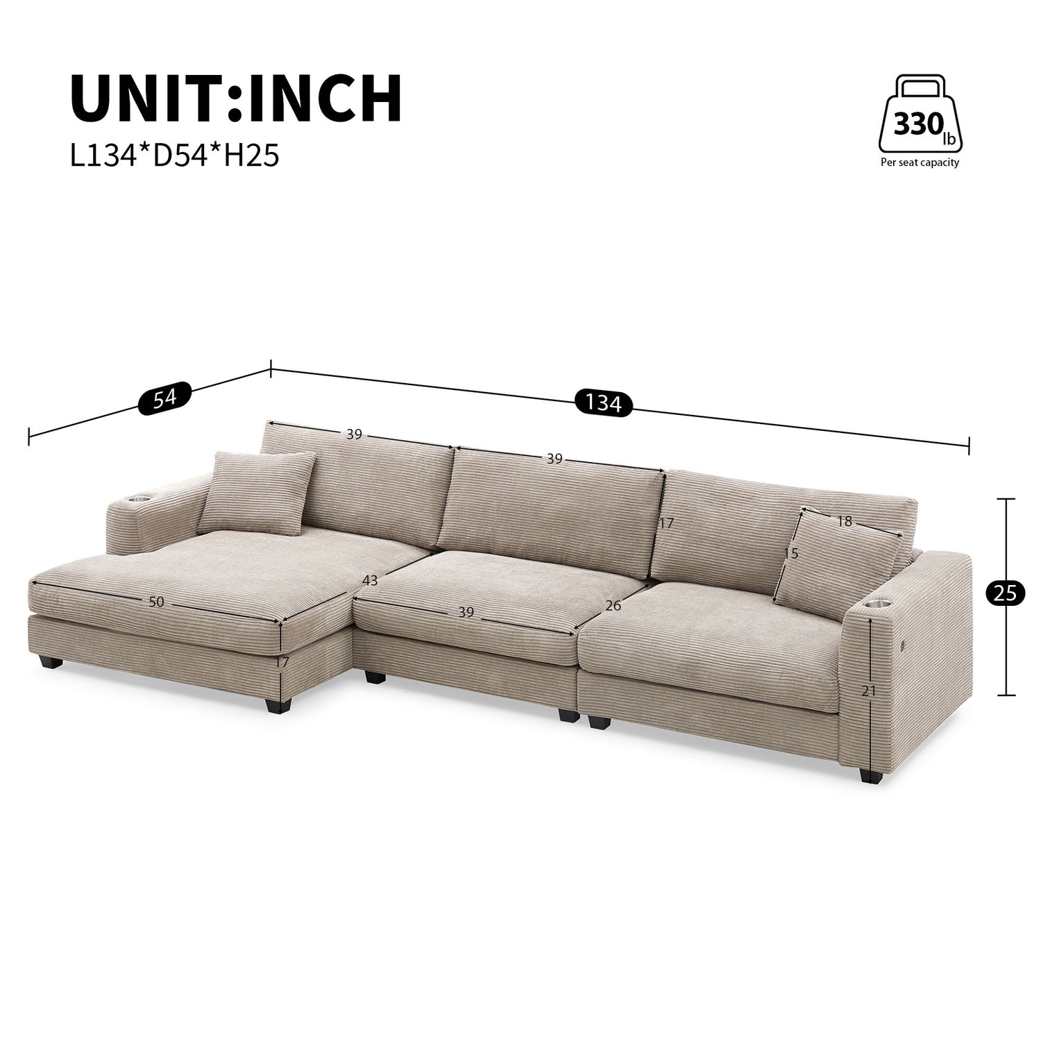 Oversized Sectional L Shaped Cloud Couch With USB Charging Port Cup Holder Deep And Wide Seat Sofa With Chaise Comfy - Beige