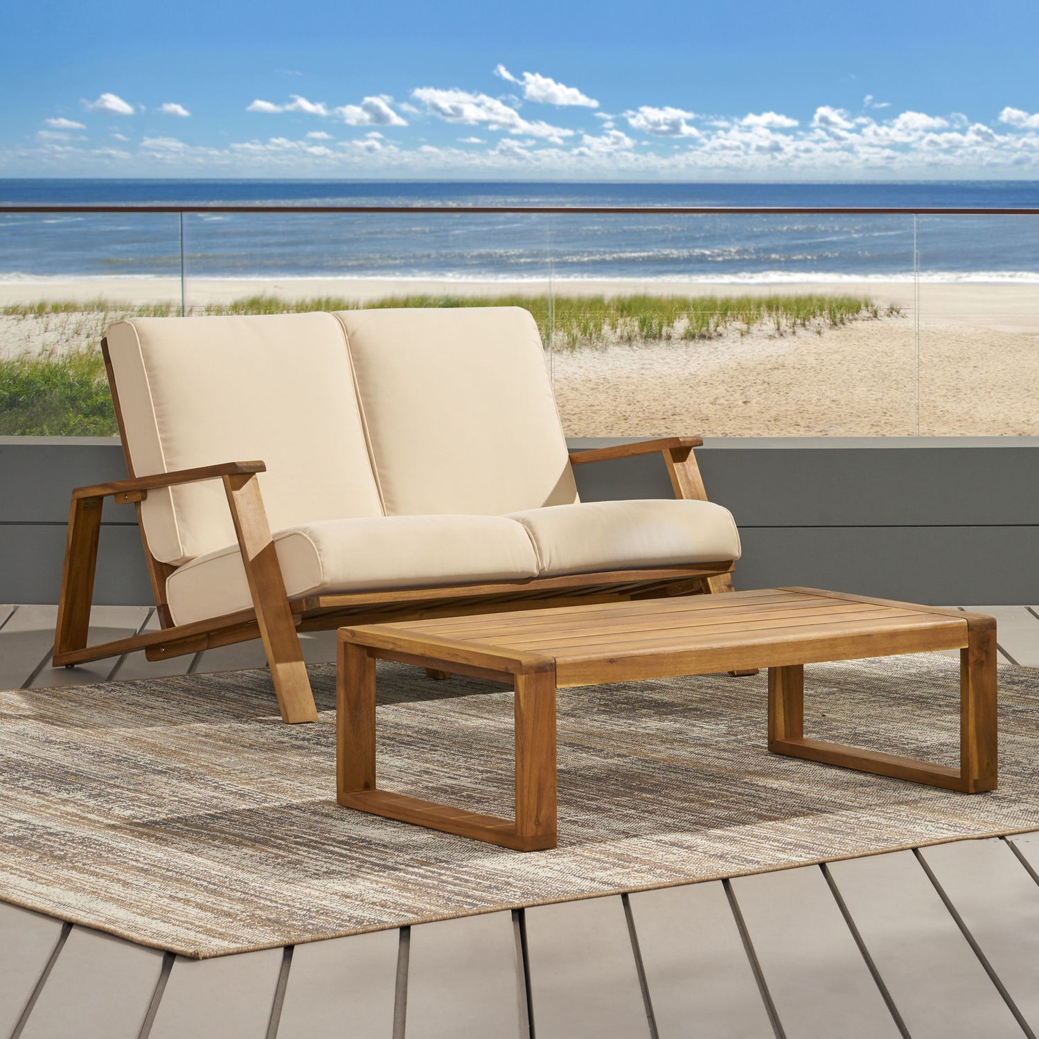 Paloma - Loveseat And Coffee Table Set With Adirondack Design Acacia Wood And Waterproof Fabric - Teak / Beige