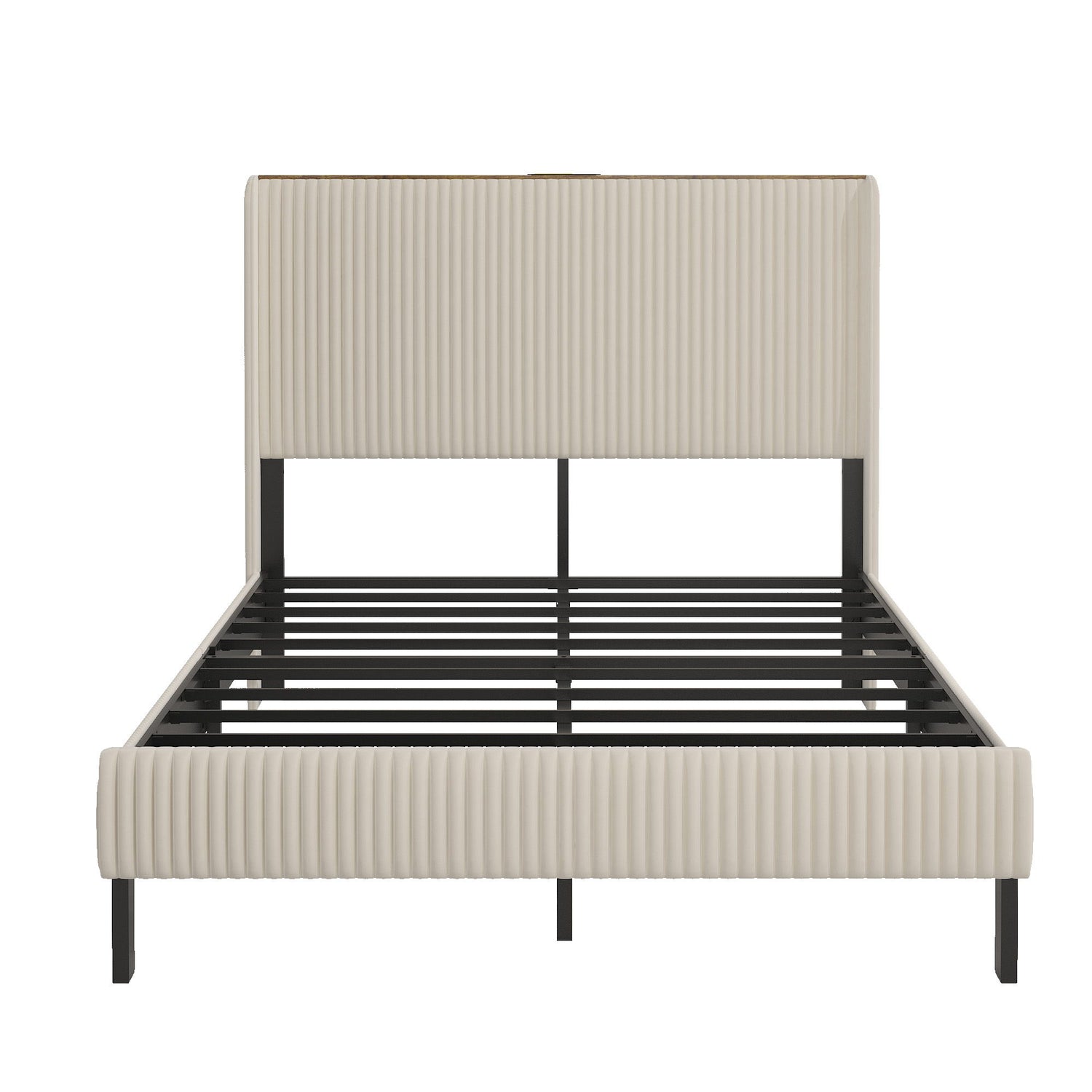 Full Size Platform Bed Frame With Charging Station And Noise Free Design - Beige