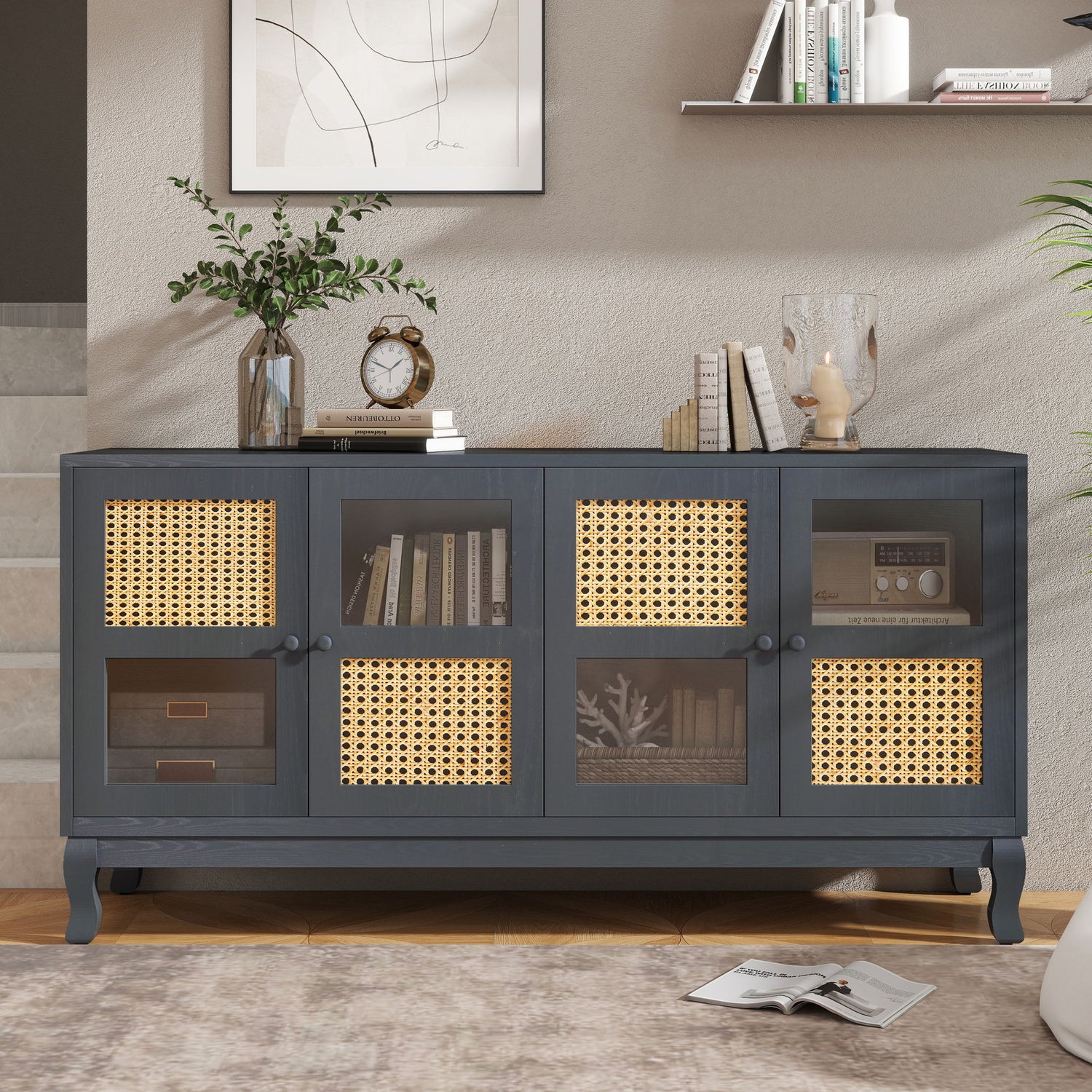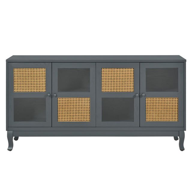 Retro Industrial Gray 4 Door Sideboard With Large Storage, Rattan And Glass Doors - Antique Dark Gray / Rattan