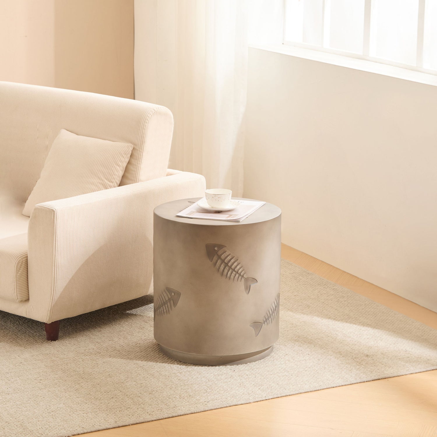 Rustic Magnesium Oxide Side Table With Fish Pattern Design - Gray