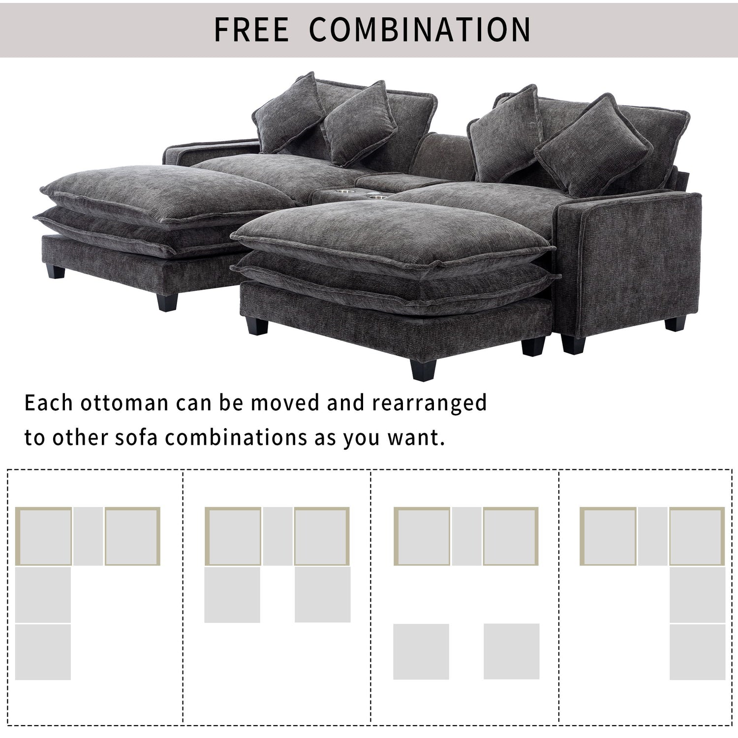 Modern Chenille Upholstered Sectional Sofa With Ottomans, USB Ports, Cup Holders, And Storage - Gray