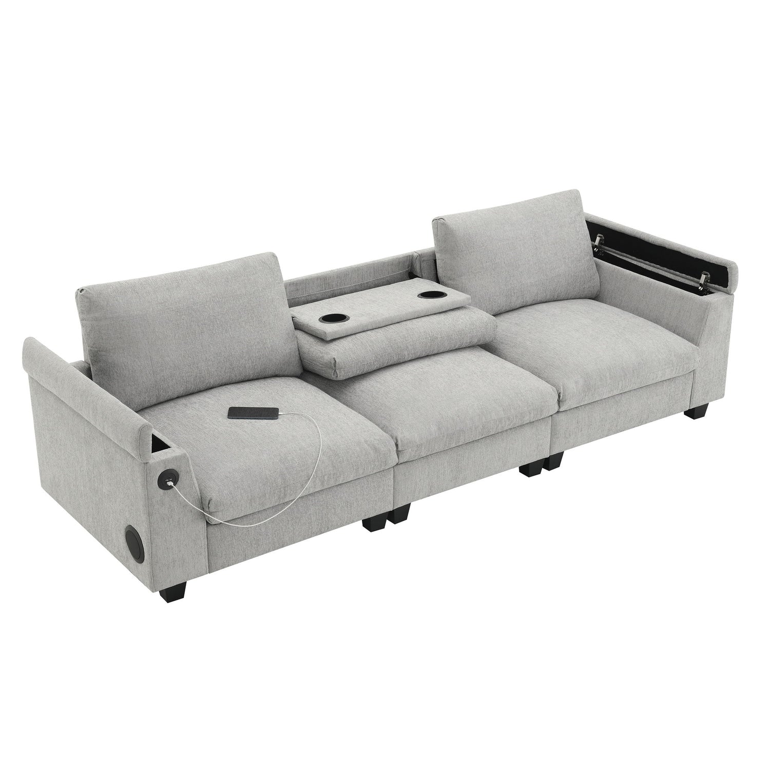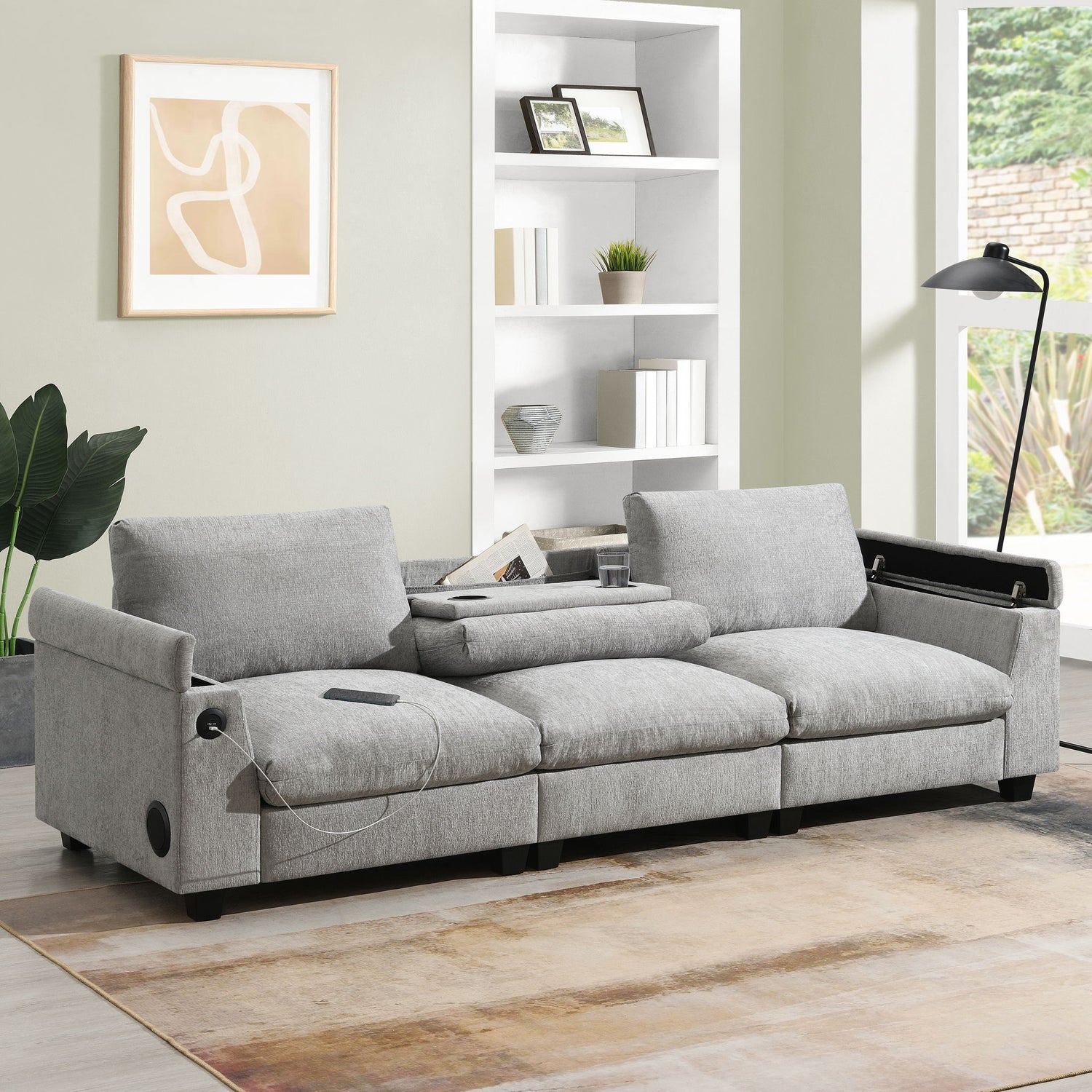 Sectional With Bluetooth Speaker Comfy Cloud Couch Set With Drop Down Table Cup Holders, USB Charger Storage Armrest Wide Seat Sofa - Gray