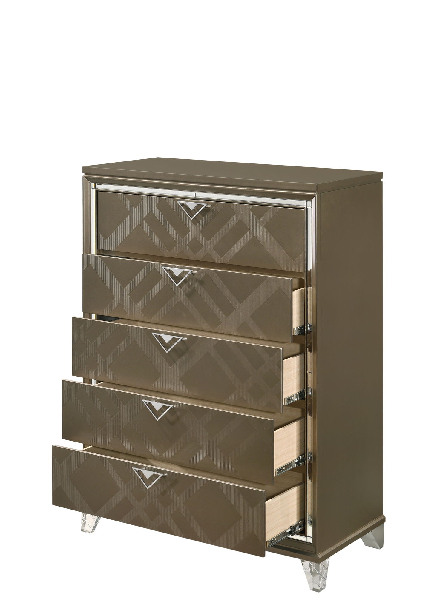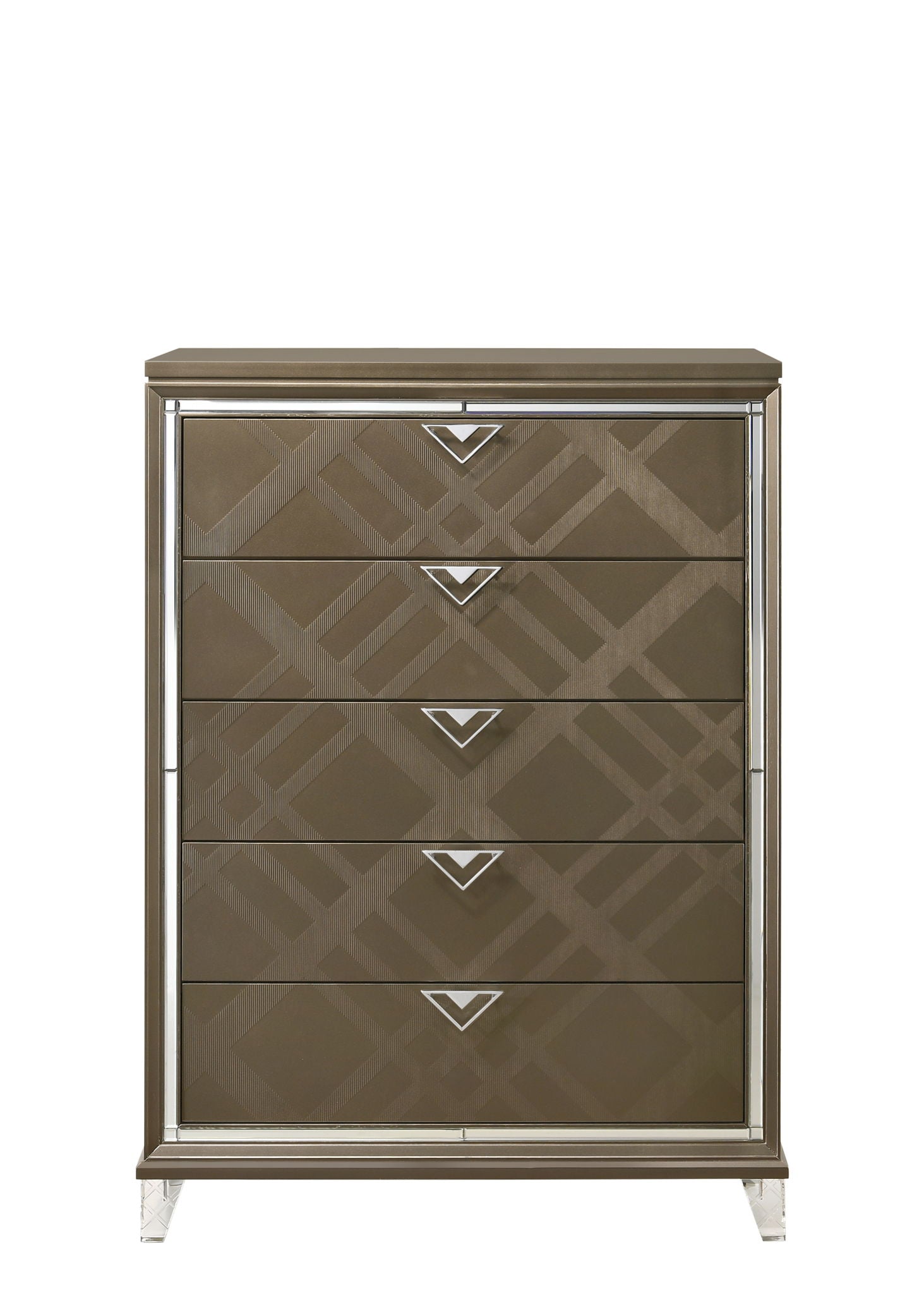- Elegant Design: This sophisticated 5-drawer chest combines elegance with functionality, featuring embossed fronts that add subtle texture and depth to the design.