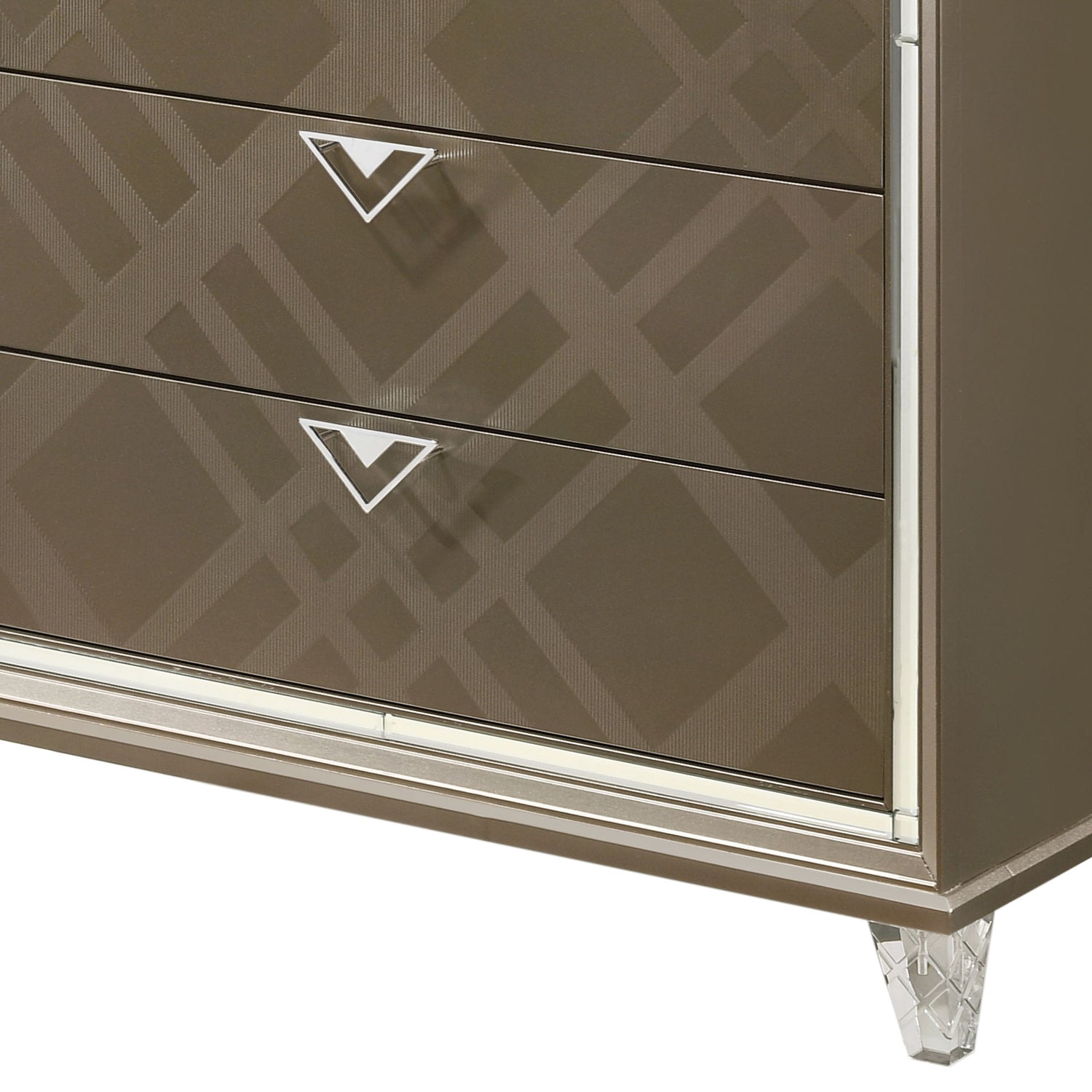 - Contemporary Style: Resting on sleek acrylic tapered legs, this chest blends contemporary style with practical storage, making it an ideal statement piece for any bedroom.