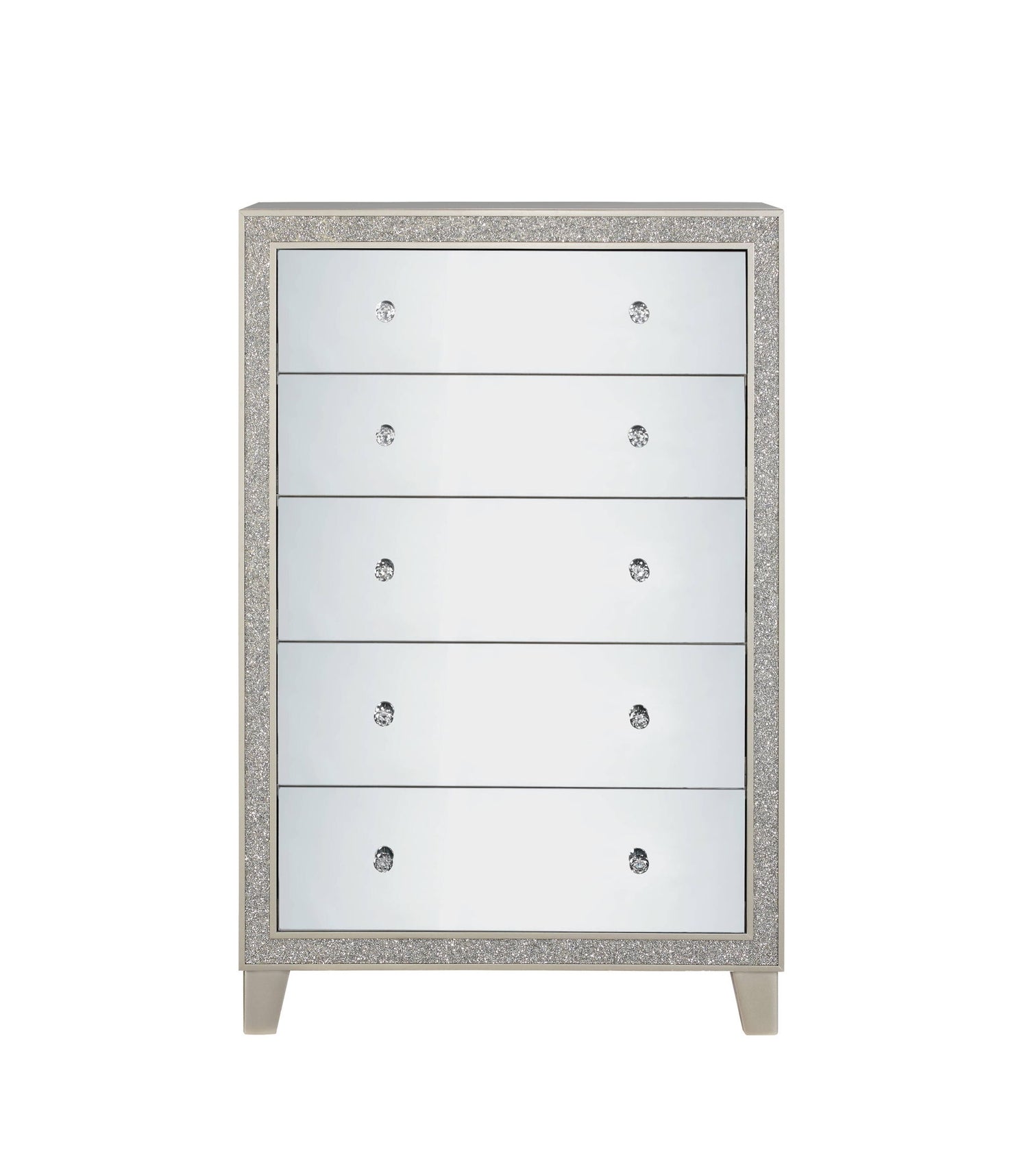 - Elegant Design: The Sliverfluff Mirrored & Champagne Finish Chest features a stylish mirrored front drawer and acrylic accents, combining modern elegance with practical storage solutions.