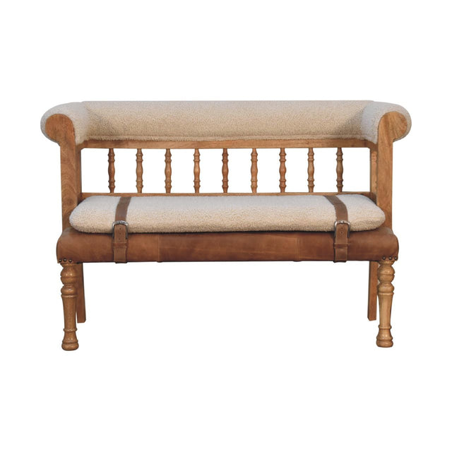 - Strapped Hallway Bench - Add some luxury style to your home living area with this fabulous carved hallway bench. It is constructed from 100% solid mango wood in an oak-ish finish and upholstered in 100% cream boucle which is presented on the seat and backrest. Other features include buffalo leather buckle straps which can be secured or undone and hand turned front legs.