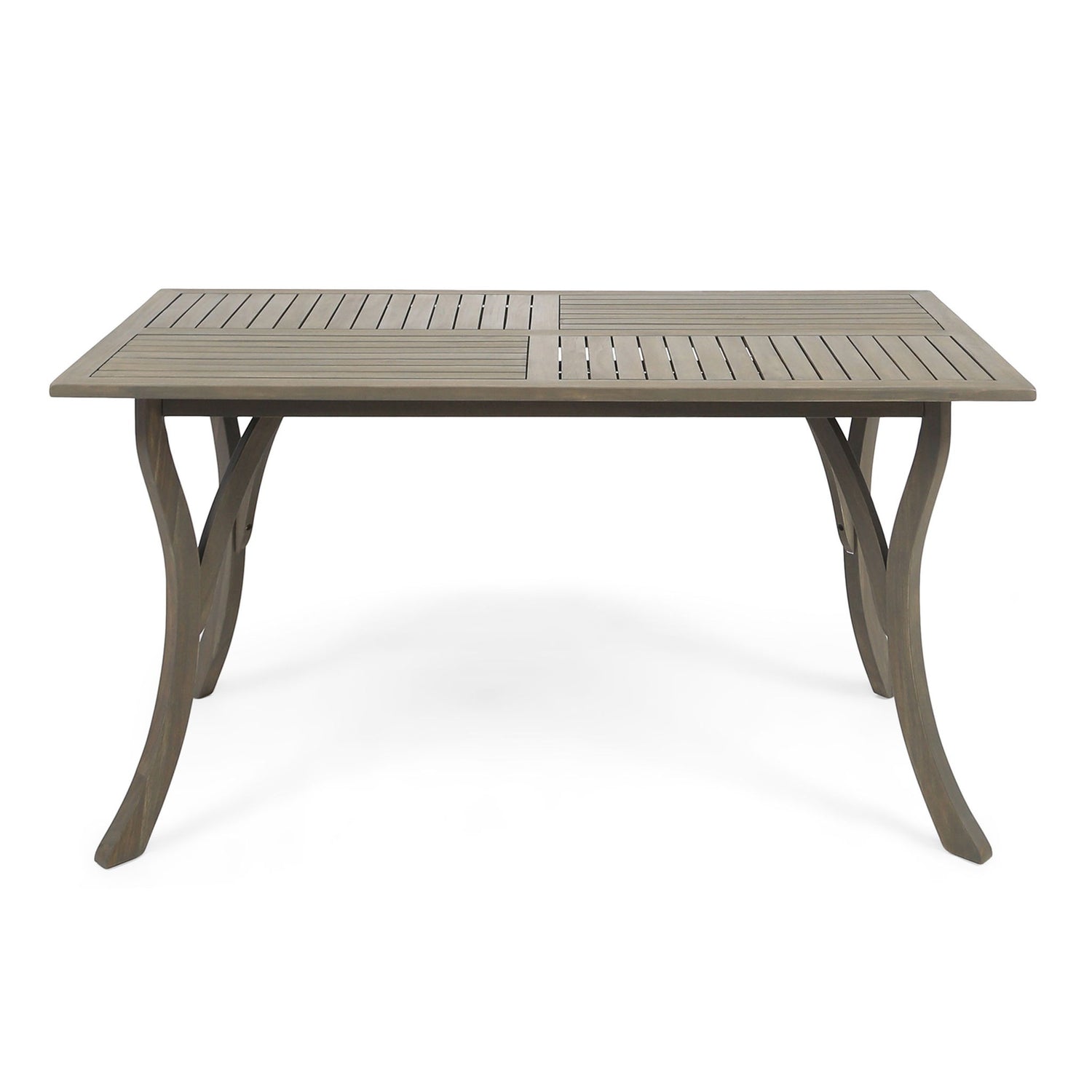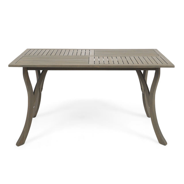 Transitional Acacia Wood Dining Table With Slat Panel Top - Gray is backordered and will ship as soon as it is back in stock.