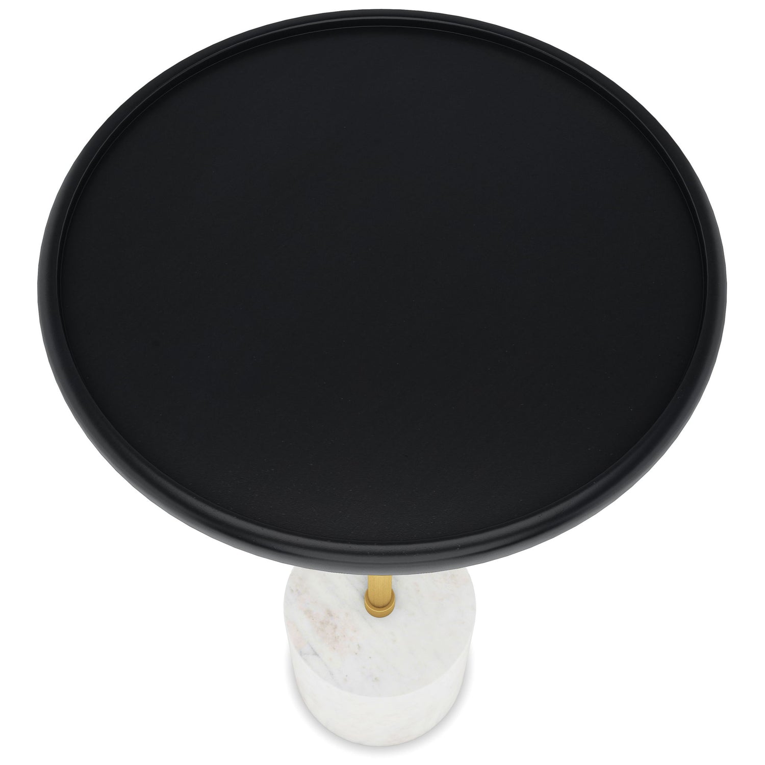 - Features round solid mango wood top, antique brass look stem and solid white marble base