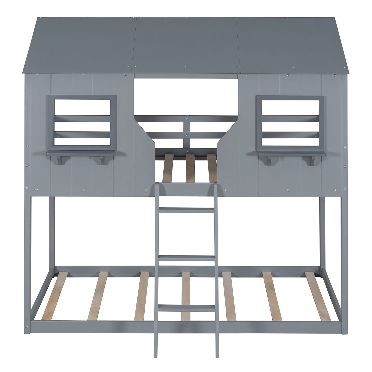 Twin Over Twin Bunk Bed With Roof, Window, Guardrail, Ladder - Gray