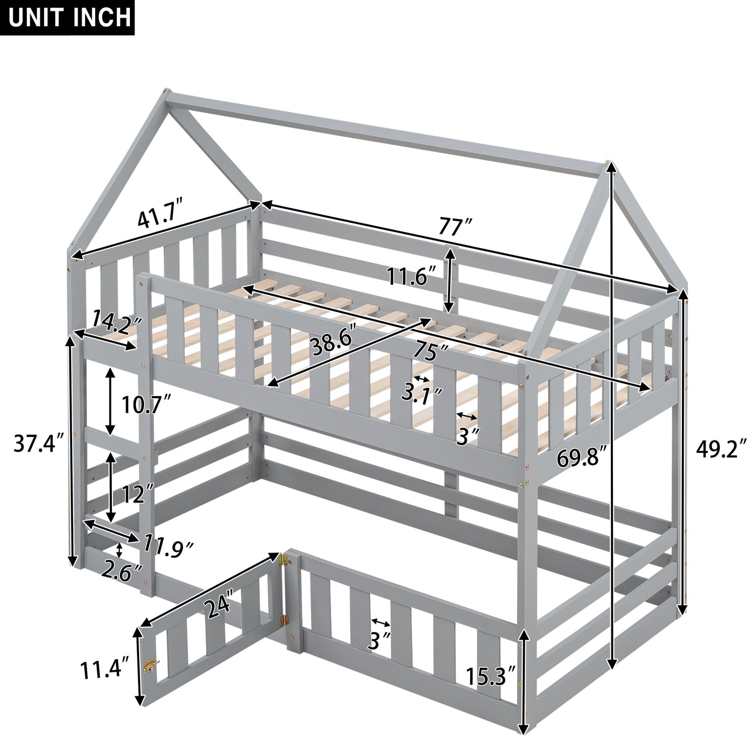 Twin Over Twin House Bunk Bed With Fence And Door - Gray is backordered and will ship as soon as it is back in stock.