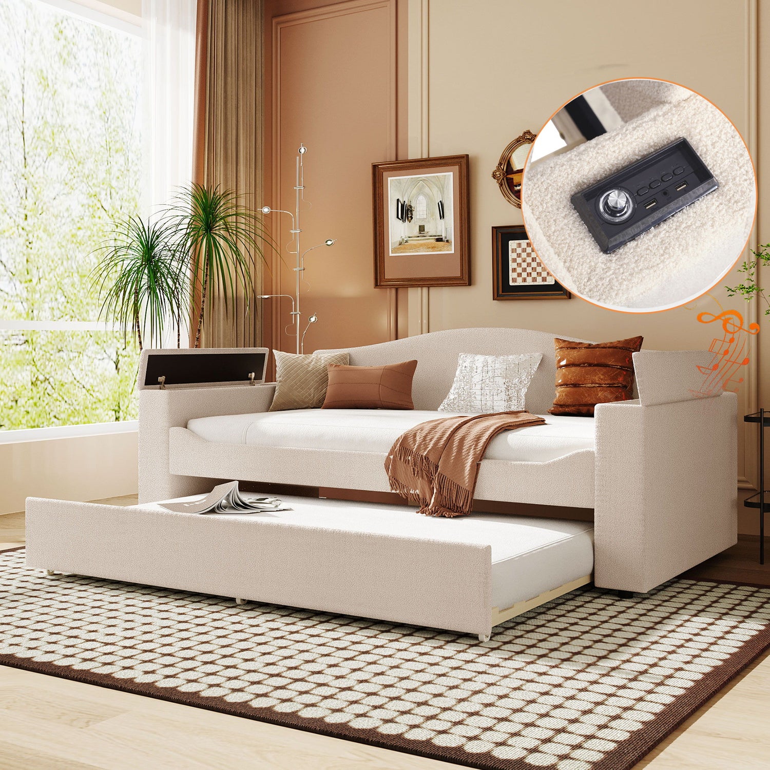 Upholstered Daybed With Storage Armrests, Trundle And Latest Integrated Bluetooth Audio System