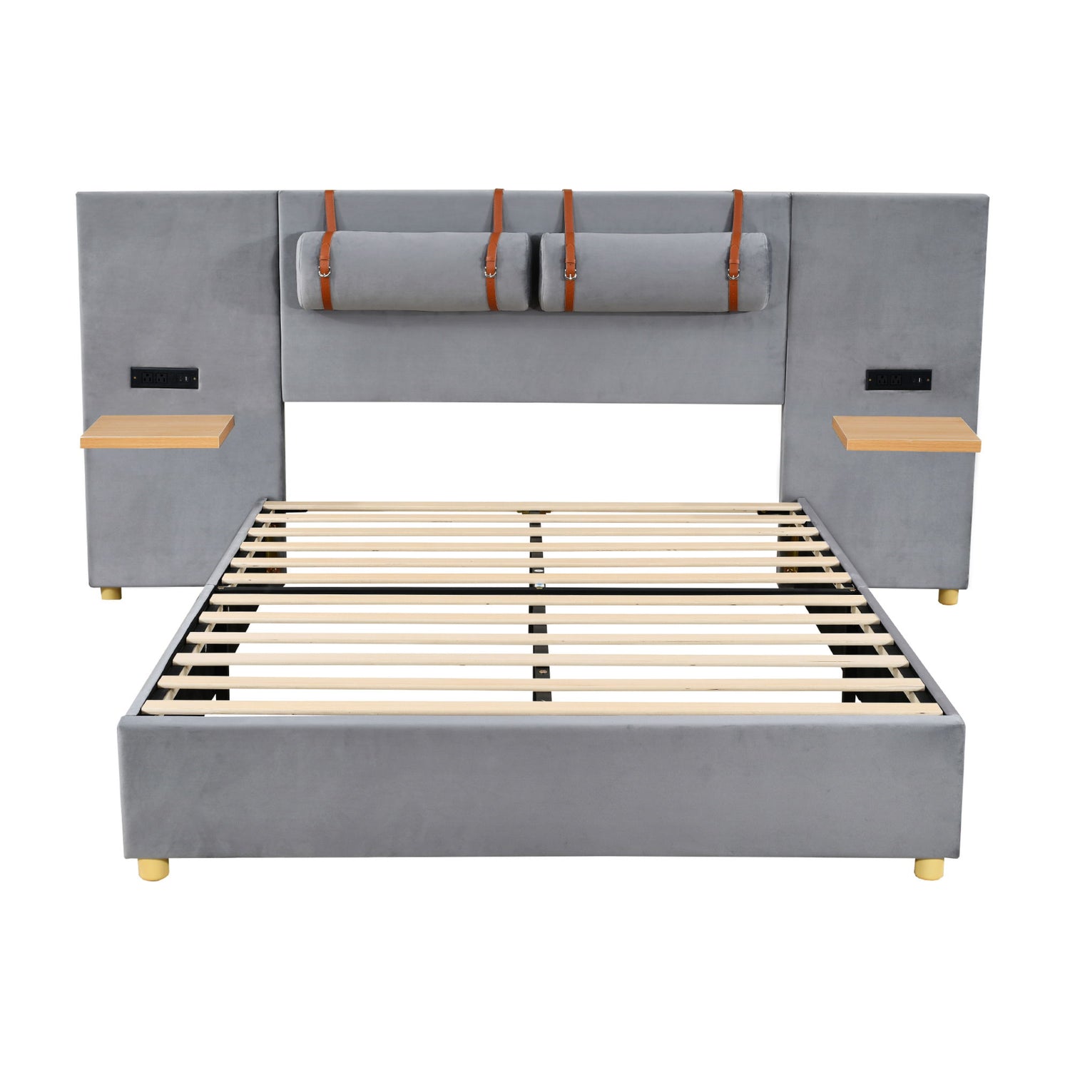 Queen Upholstered Platform Bed, 2 Outlets And USB Charging Ports On Both Sides, 2 Bedside Pillows, Storage Shelves - Gray