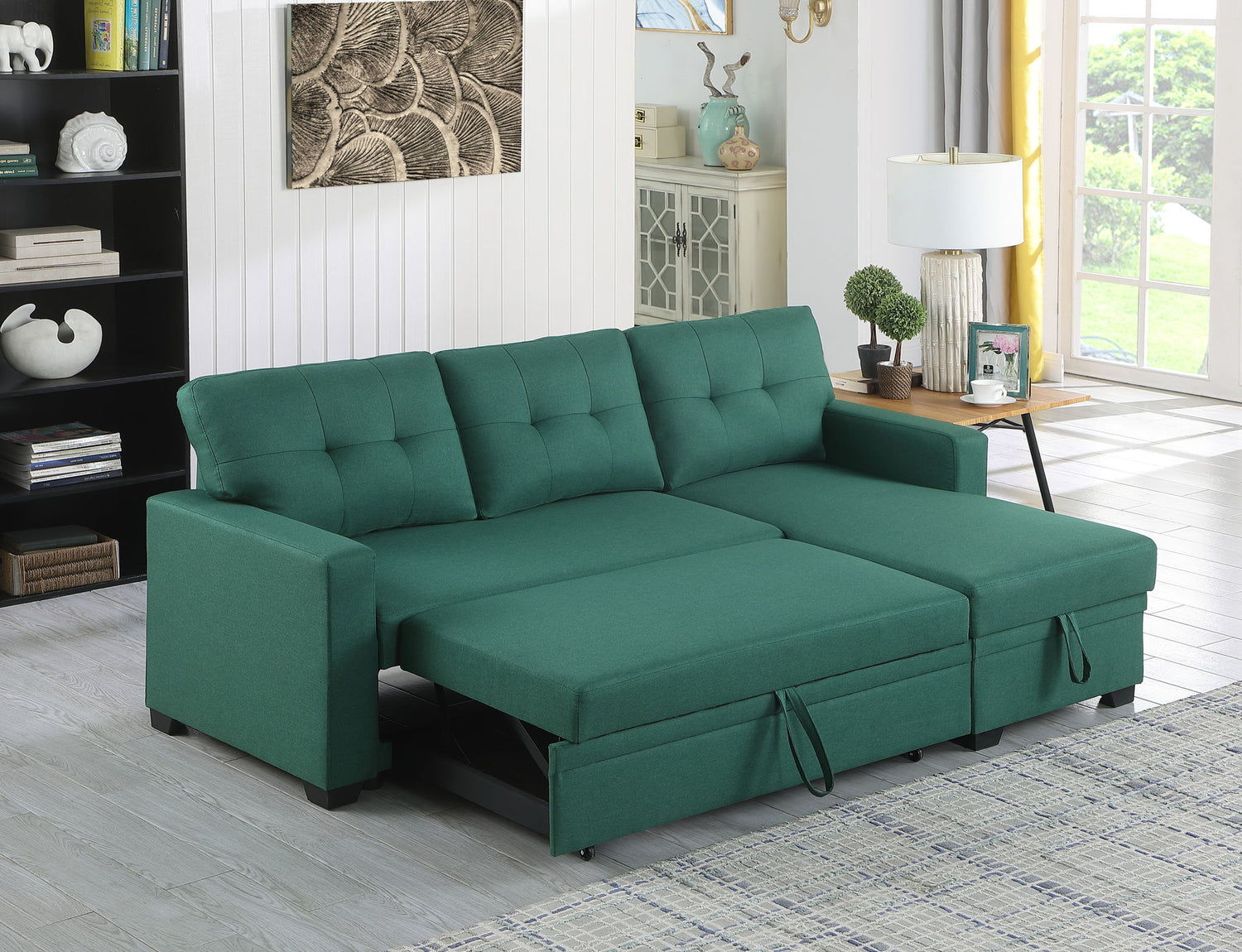 Upholstered Pull Out Sectional Sofa With Chaise - Green