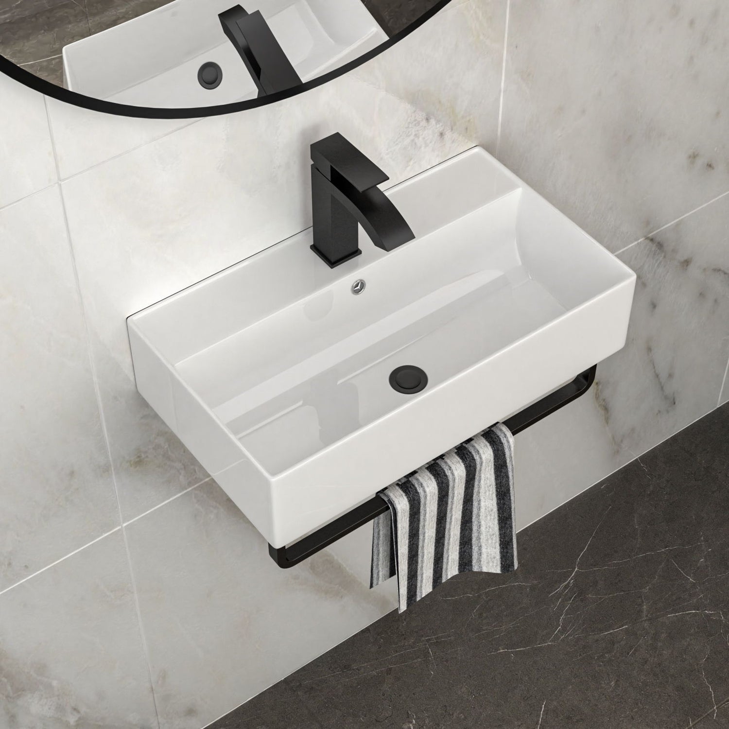 Wall Mounted Rectangular Bathroom Sink With Towel Bar & Overflowfaucet - White / Black